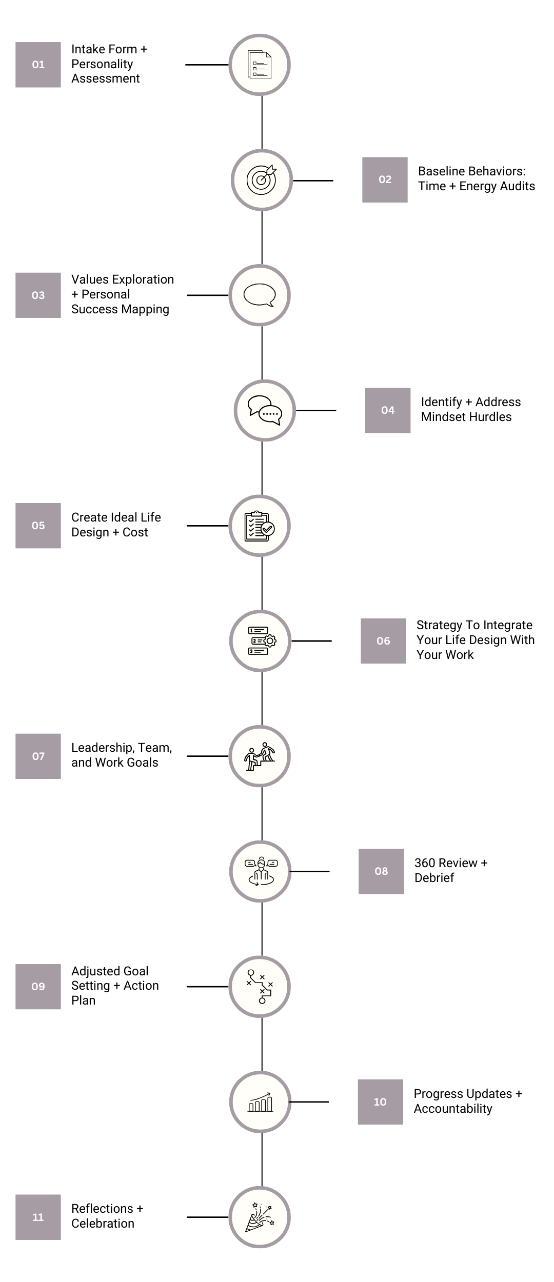 We will leave space to move in and out of tactical needs in real time while keeping an eye on your larger goals and general well-being.