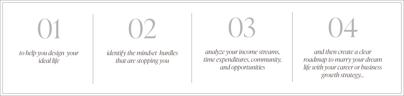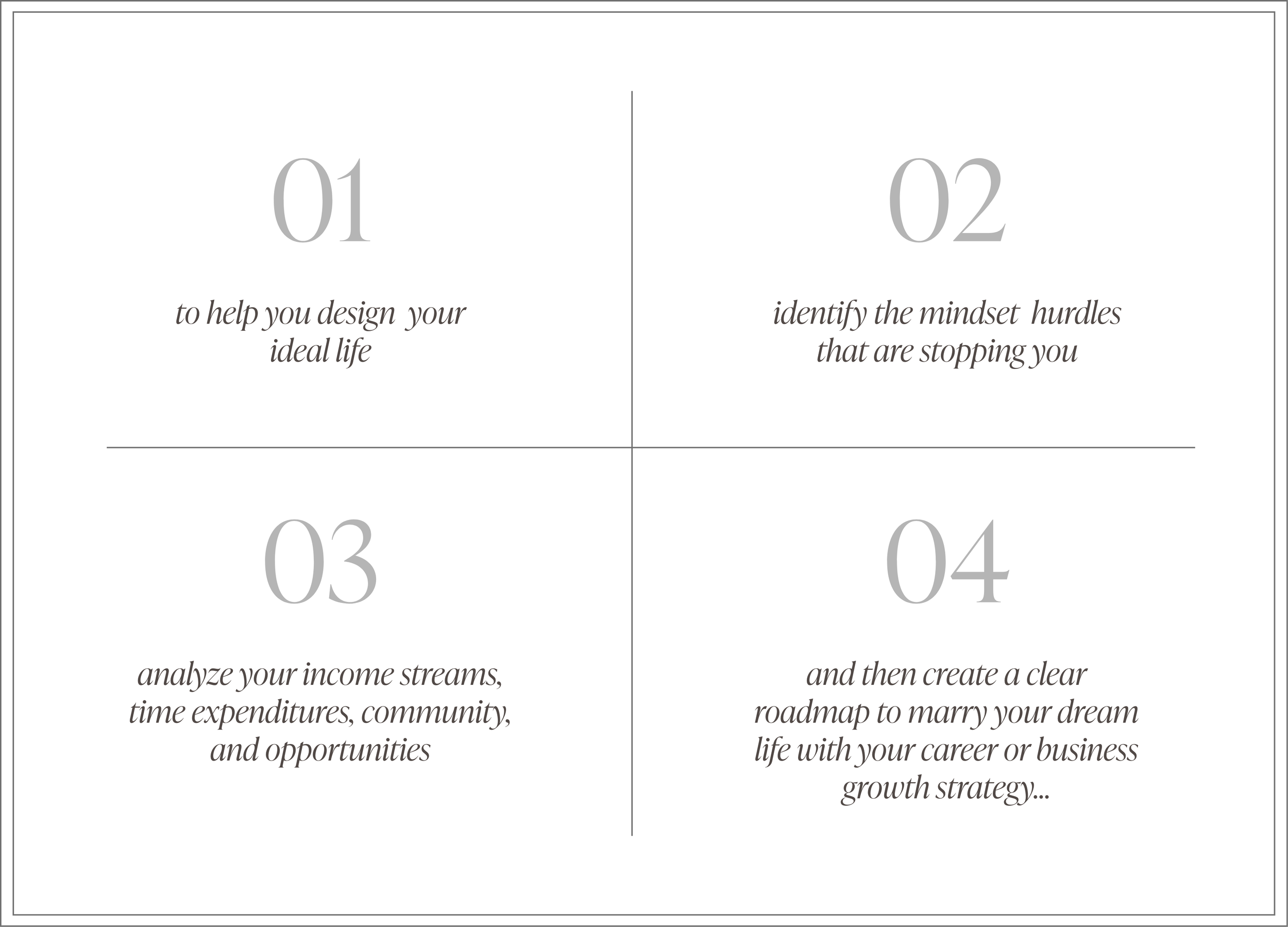 ○ We’ll lay out a clear roadmap to marry your dream life with your growth strategy.